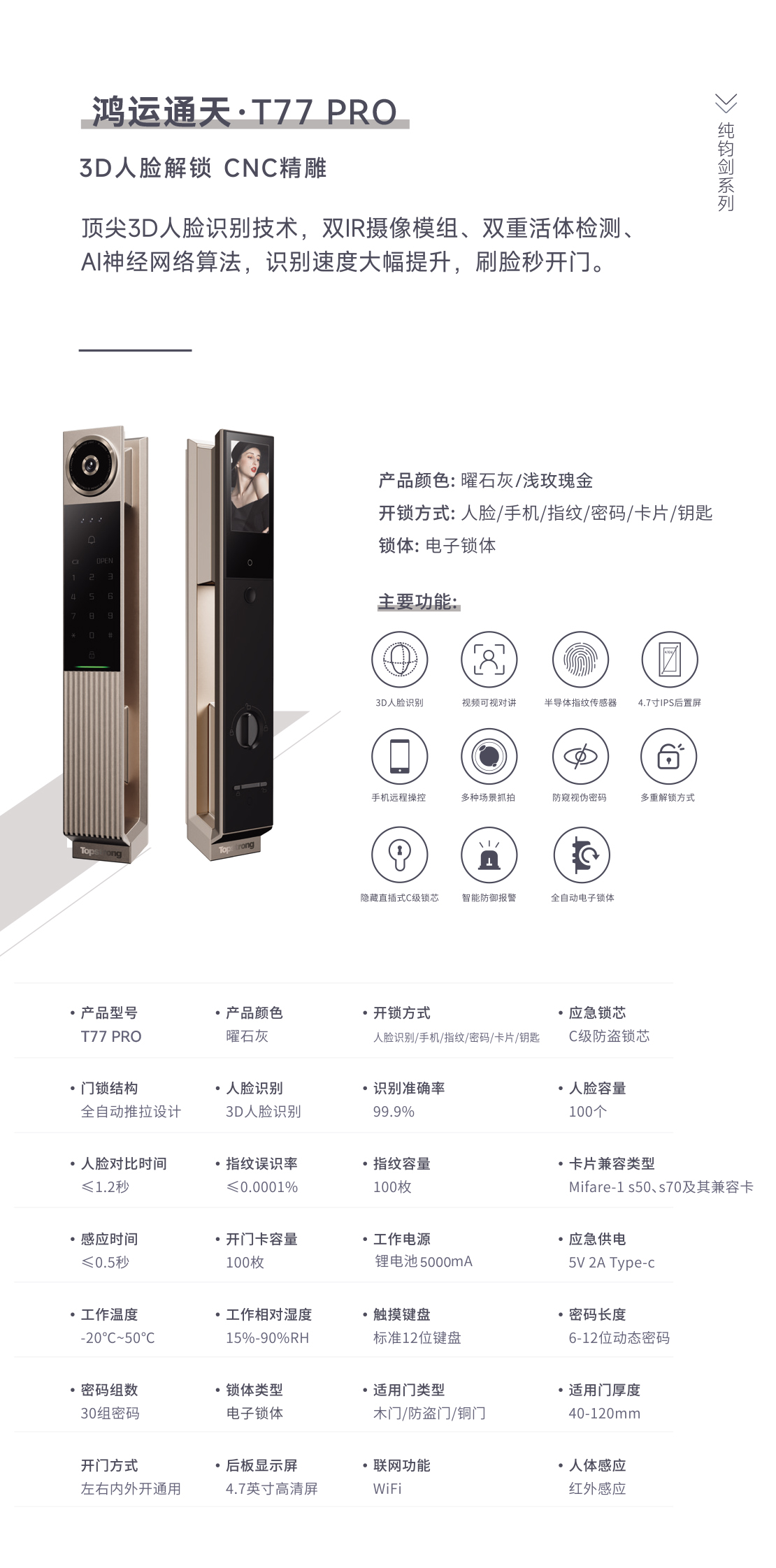• 开锁方式:人脸/手机/指纹/密码/卡片/组合/应急机械钥匙