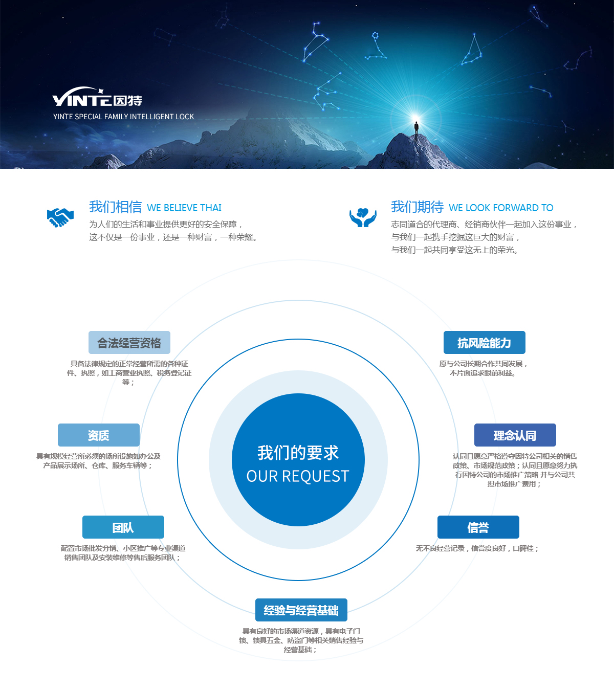 我们要求为保证双方的利益,我们期待符合如下条件的合作伙伴一起致富: